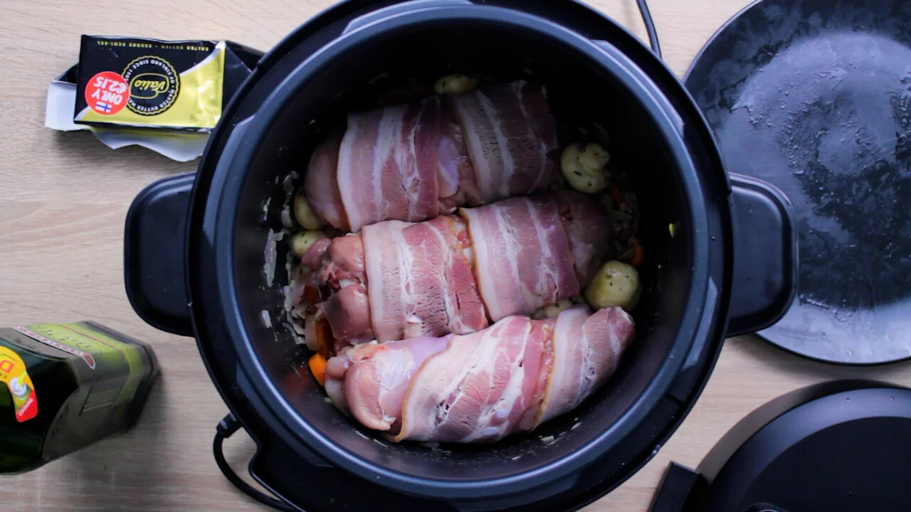 6.Place 2 bacon slices diagonally under the chicken and roll them around the chicken roll. These will give it a lot of flavour and will help the chicken keep its shape. You don't need any toothpicks.