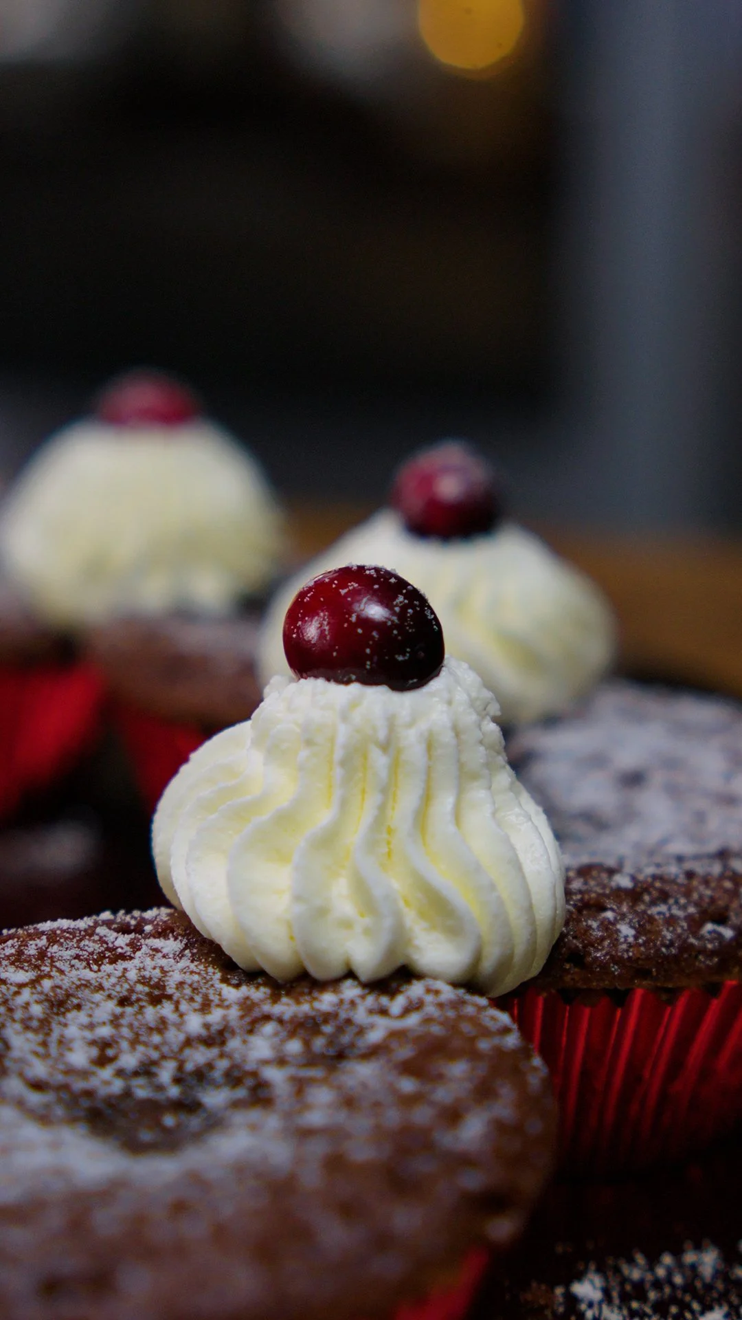 Using a piping bag, decorate the brownies with cream and cranberries and drizzle with icing sugar and maple syrup.
