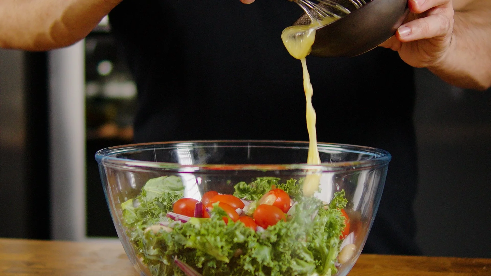 Wash the kale and drain the beans. Toss them together in a bowl, together with the onion and cherry tomatoes. Add the dressing and mix well.