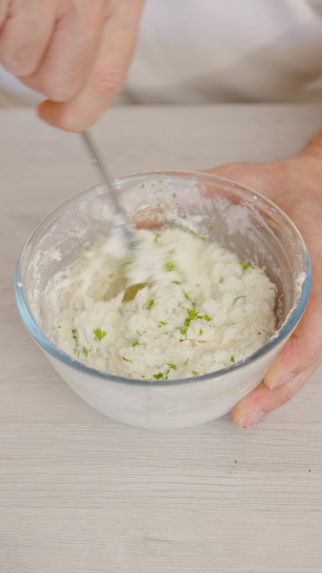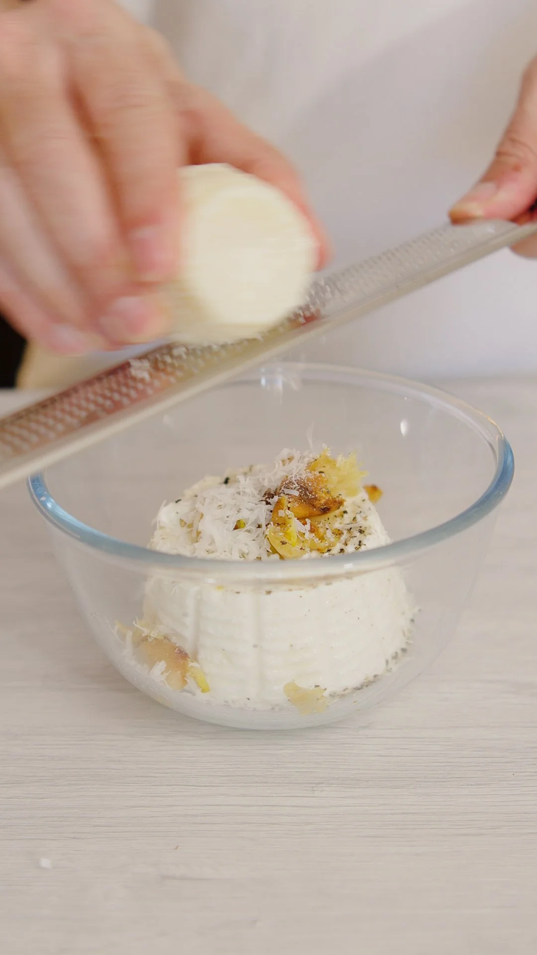 For the filling, place the irkotta in a bowl. Squeeze out the soft garlic pulp from its bulb.