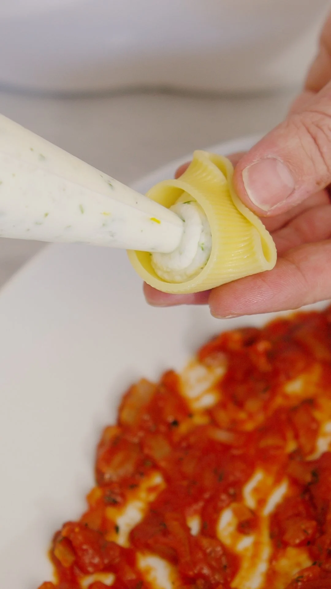 Make a layer of the filled shells on the tomato sauce. Make the shells face up so they will hold the filling well. This is a creamy filling, if you want it more solid, add an egg to the cheese mixture.