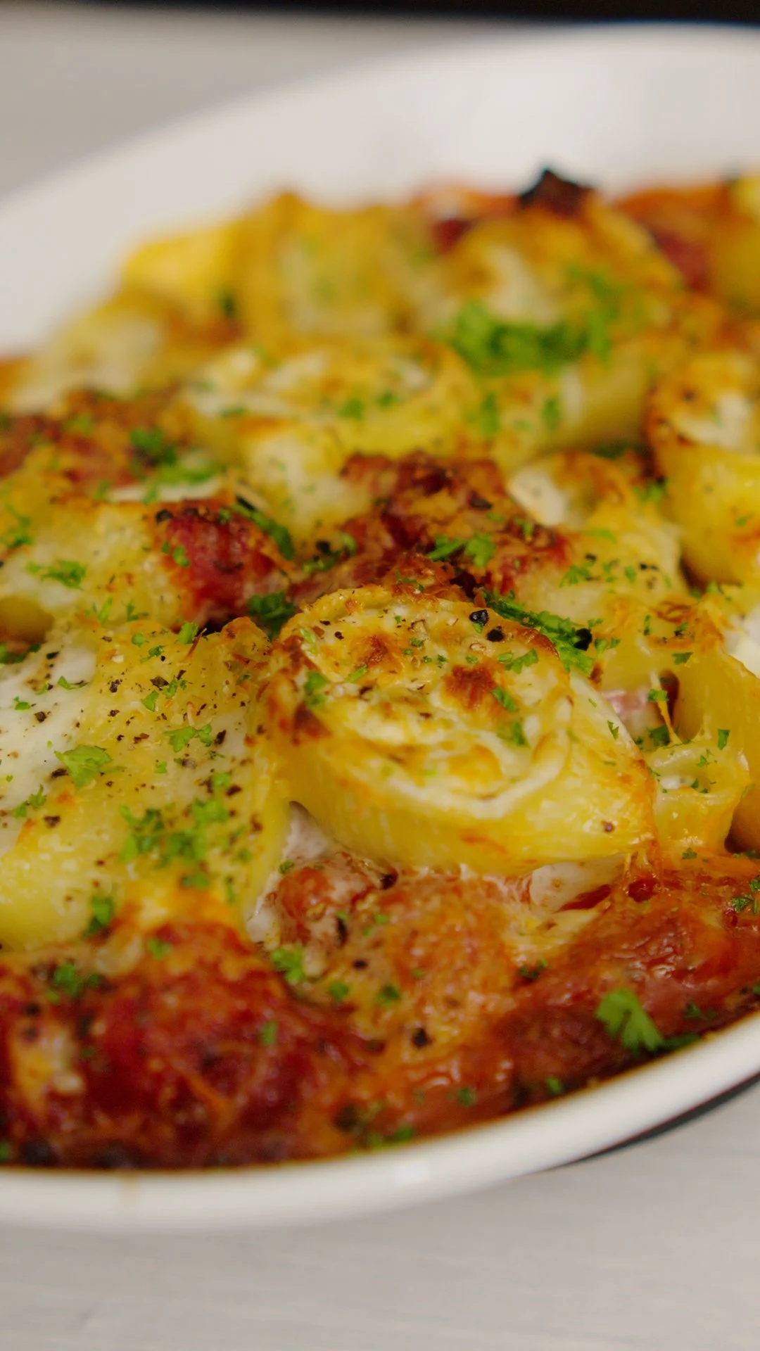Creamy garlic and parlsey flavour filled pasta shells with tomato sauce, cream, and a hint of grated dry ġbejniet.