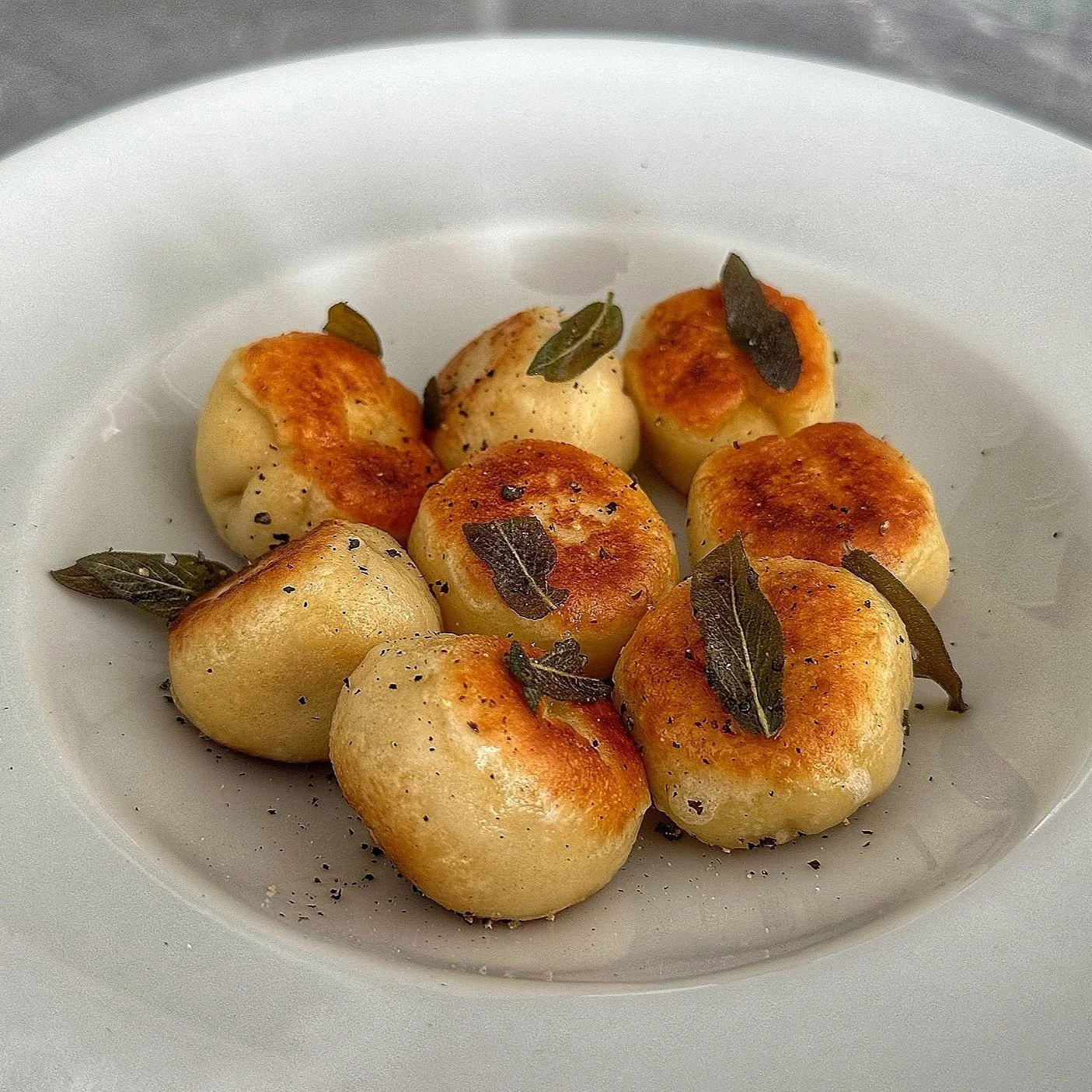 Crispy on the outside, soft and creamy on the inside. Fast to prepare potato gnocchi with a creamy fresh Gozo cheese filling and simply fried in butter and sage.