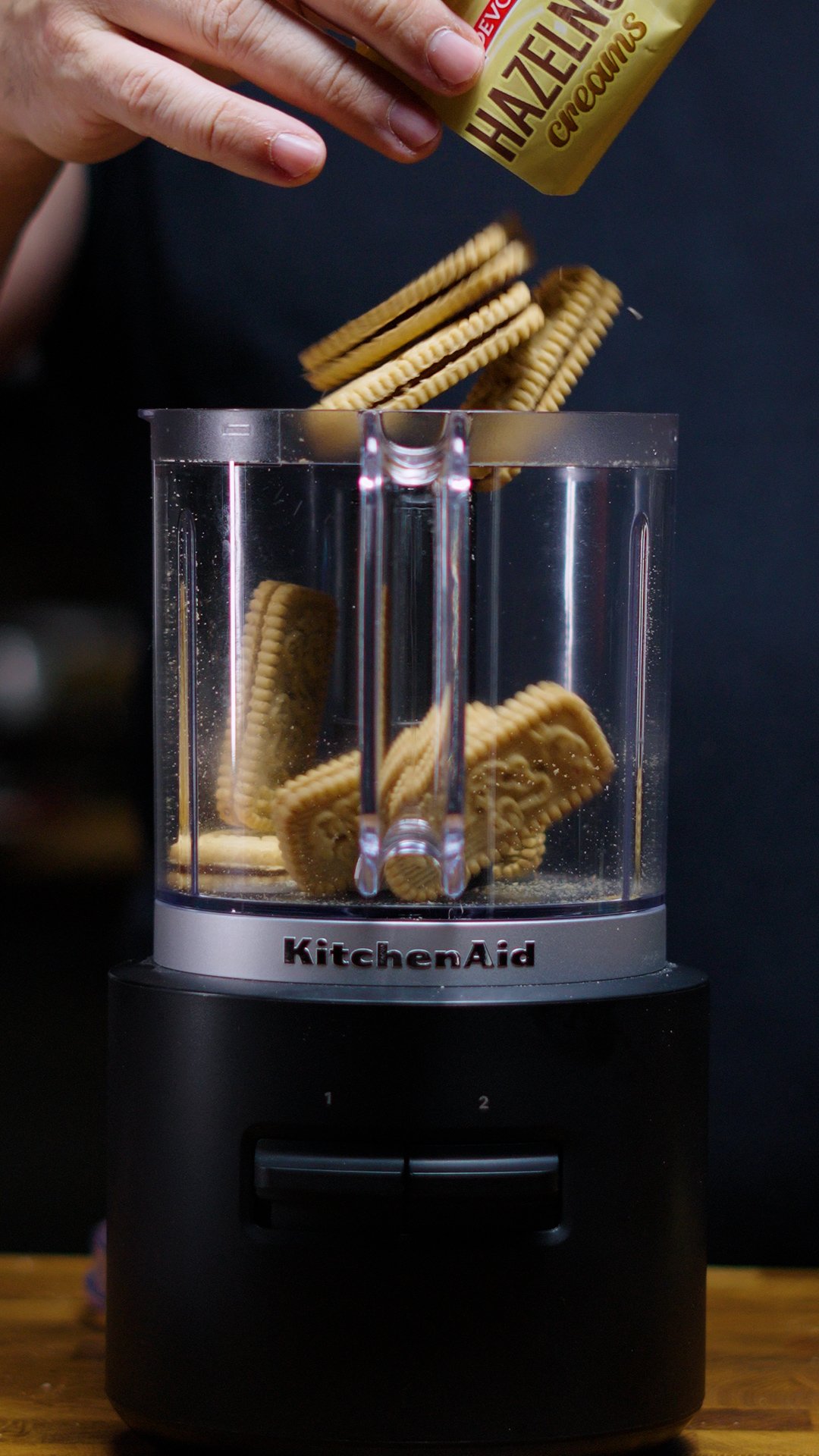 Crush the biscuits and roasted hazelnuts. Using a blender, leave some bigger bits with the pulse function.