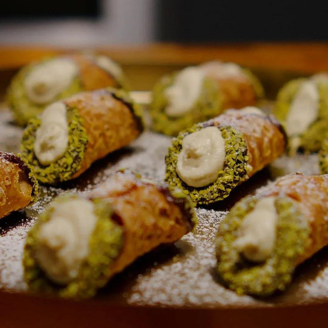 Soft irkotta and ħelwa tat-tork cream enclosed in a crunchy cannoli shell with chocolate-pistachio tips.