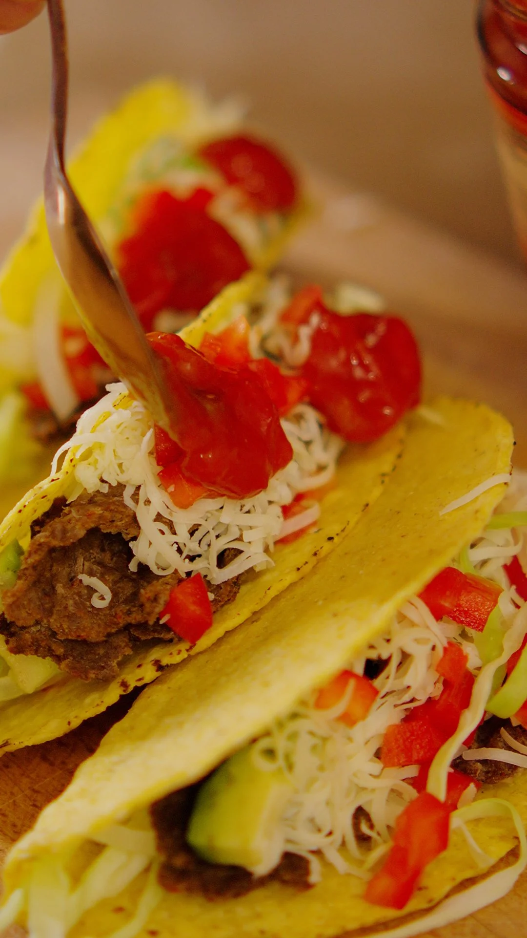 Easy homemade doner-style spicy beef, served in a taco shell with veggies & Mexican salsa.