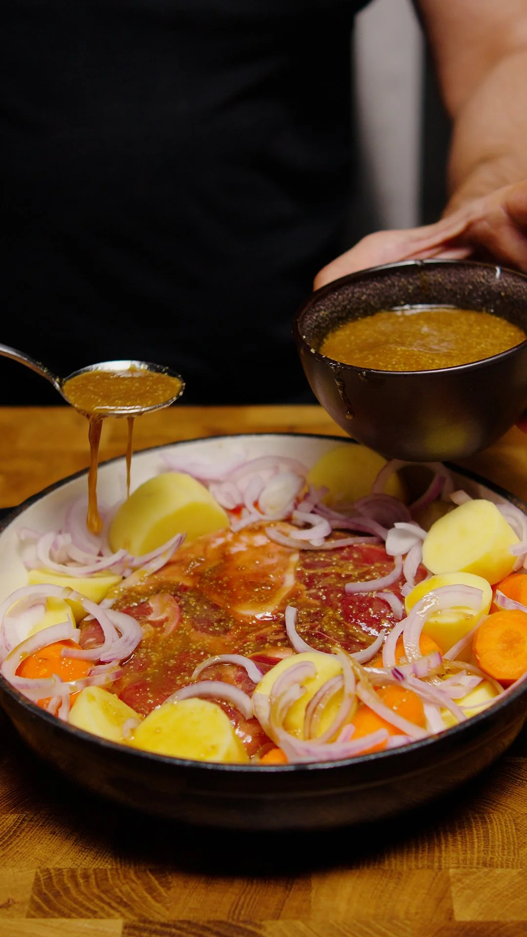 Mix the remaining marinade with the stock and pour it over the meat and vegetables.