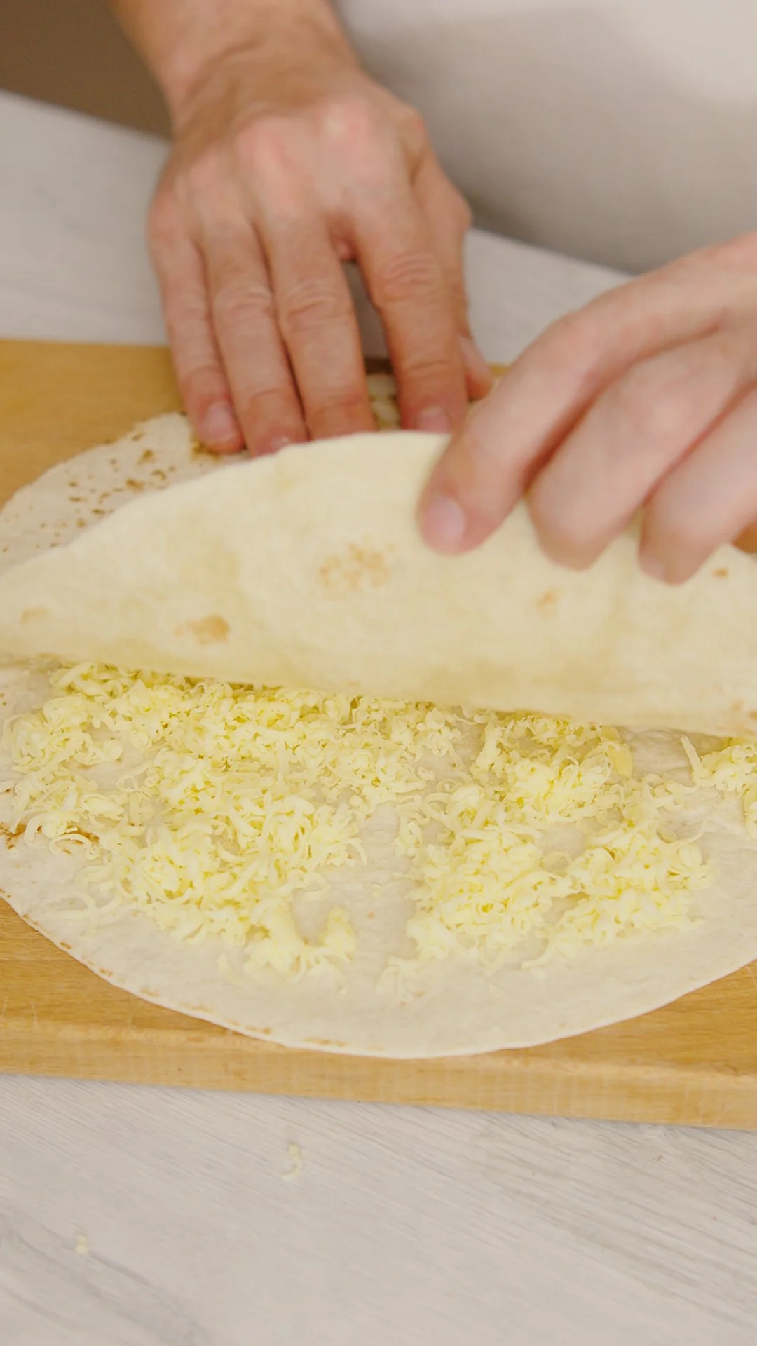 Place another wrap on top and gently press against the first wrap to sandwich the cheese in between.