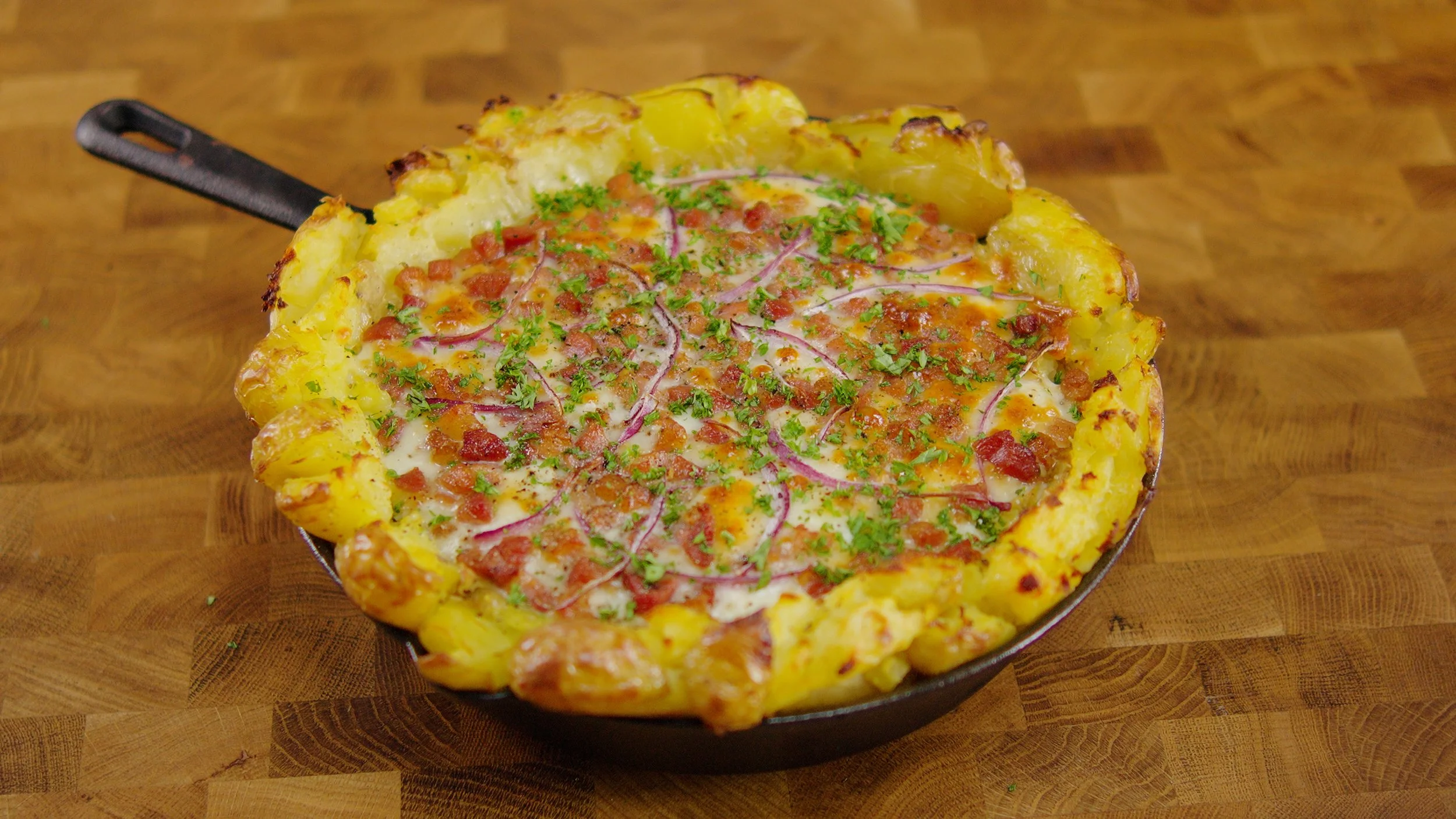 A cheese and onion pie, with crispy pancetta and a flakey potato crust.