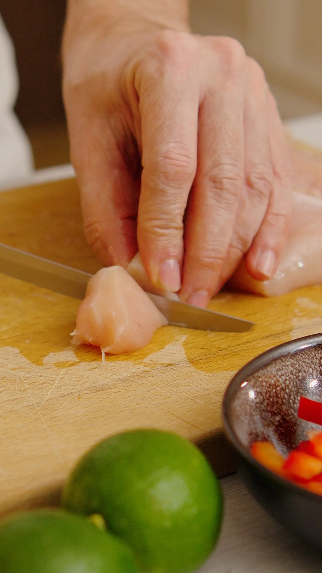 Cut the chicken breast into bite-size pieces.
