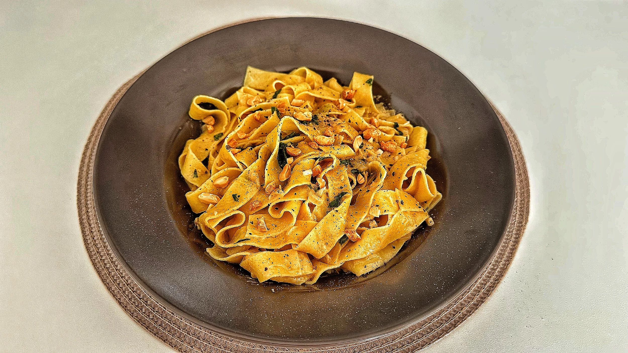 Vegan-Friendly pasta with a delicate creamy peanut butter & basil sauce.