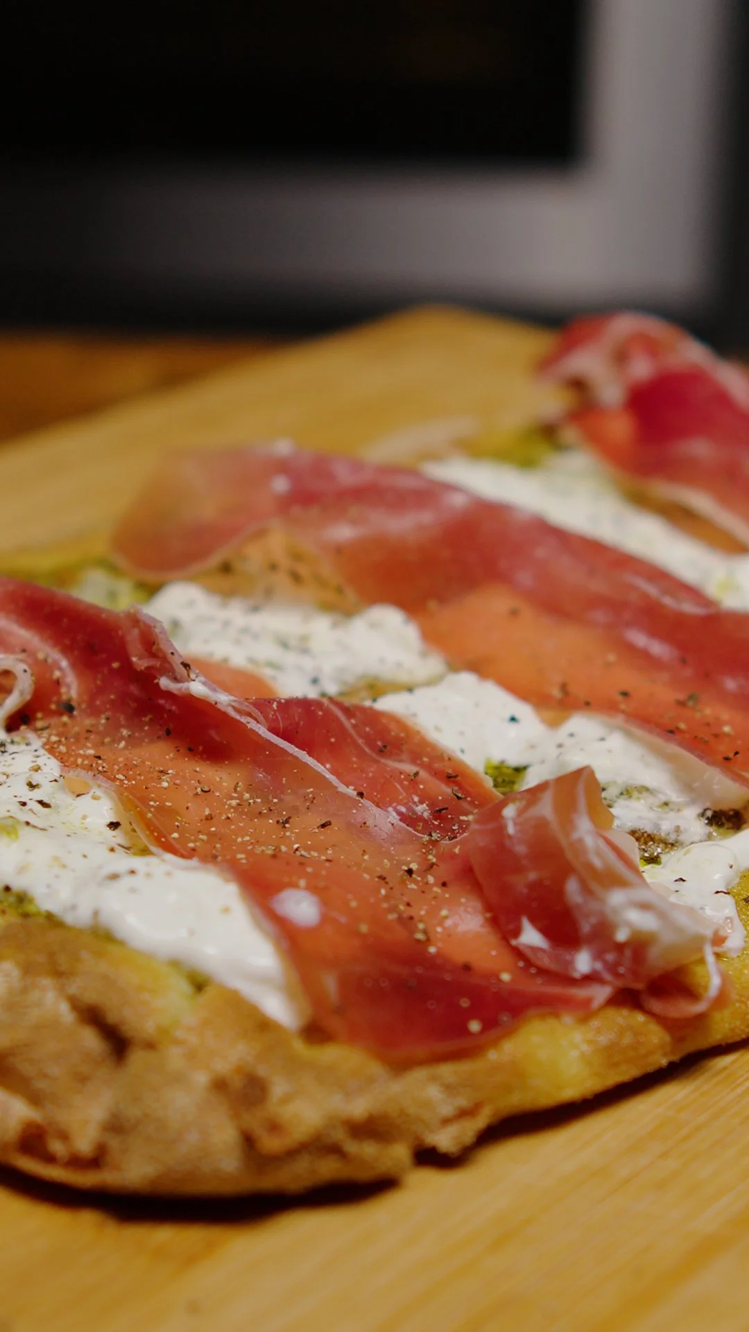 A crunchy pinsa base topped with pesto, creamy burrata cheese and flavourful Prosciutto.