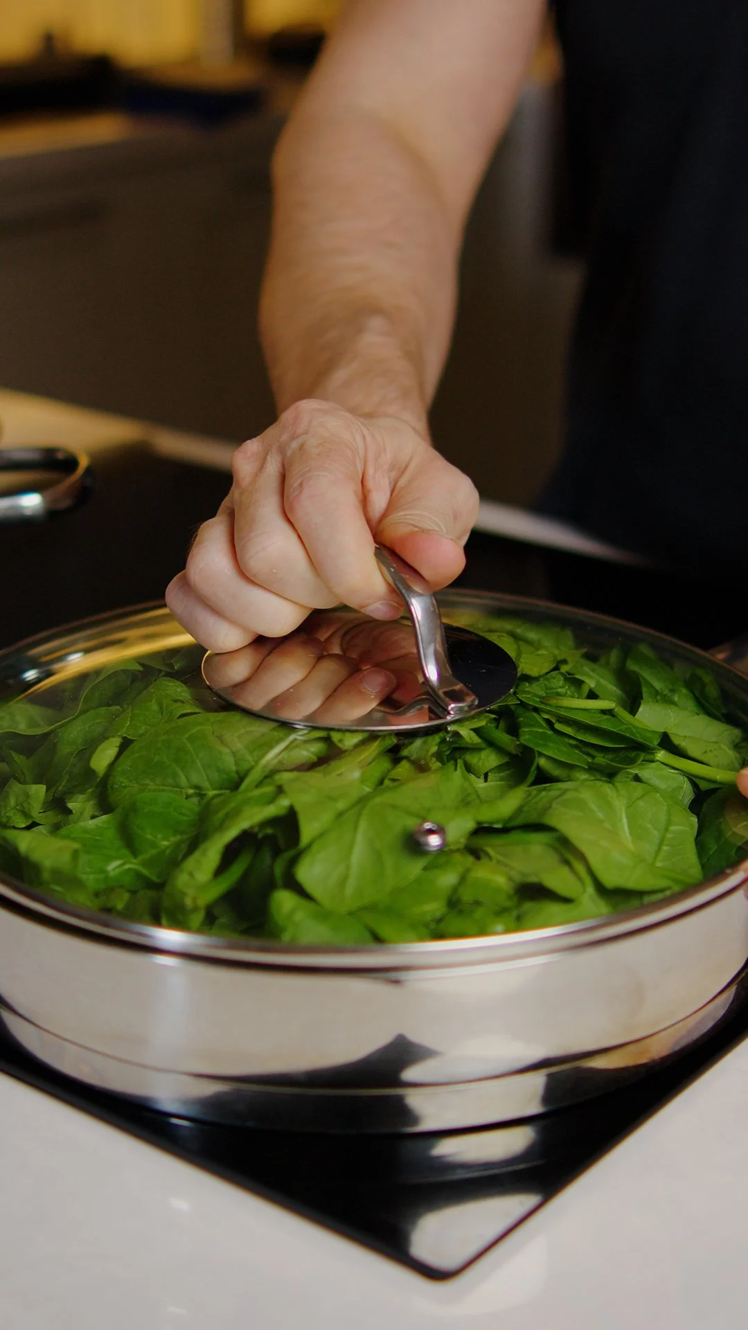 Fry the spinach in a large skillet with some olive oil and garlic over a low-med heat.