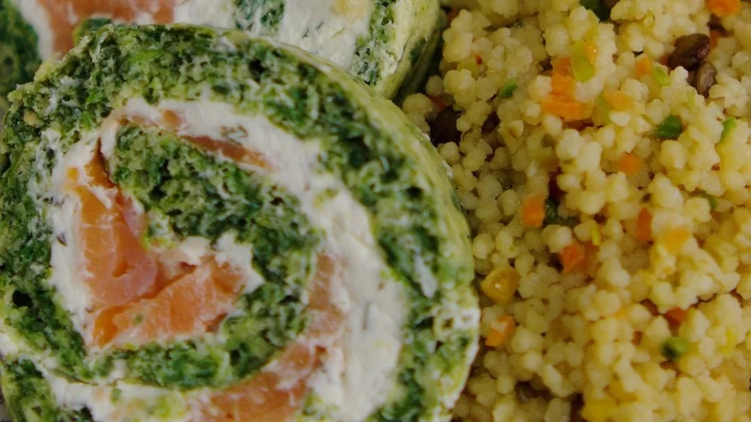 A spinach and cream cheese salmon roulade served with gourmet couscous. The best thing about this recipe is that you can prepare it ahead of time, and cut it just before serving. It can also be served as an appetizer.