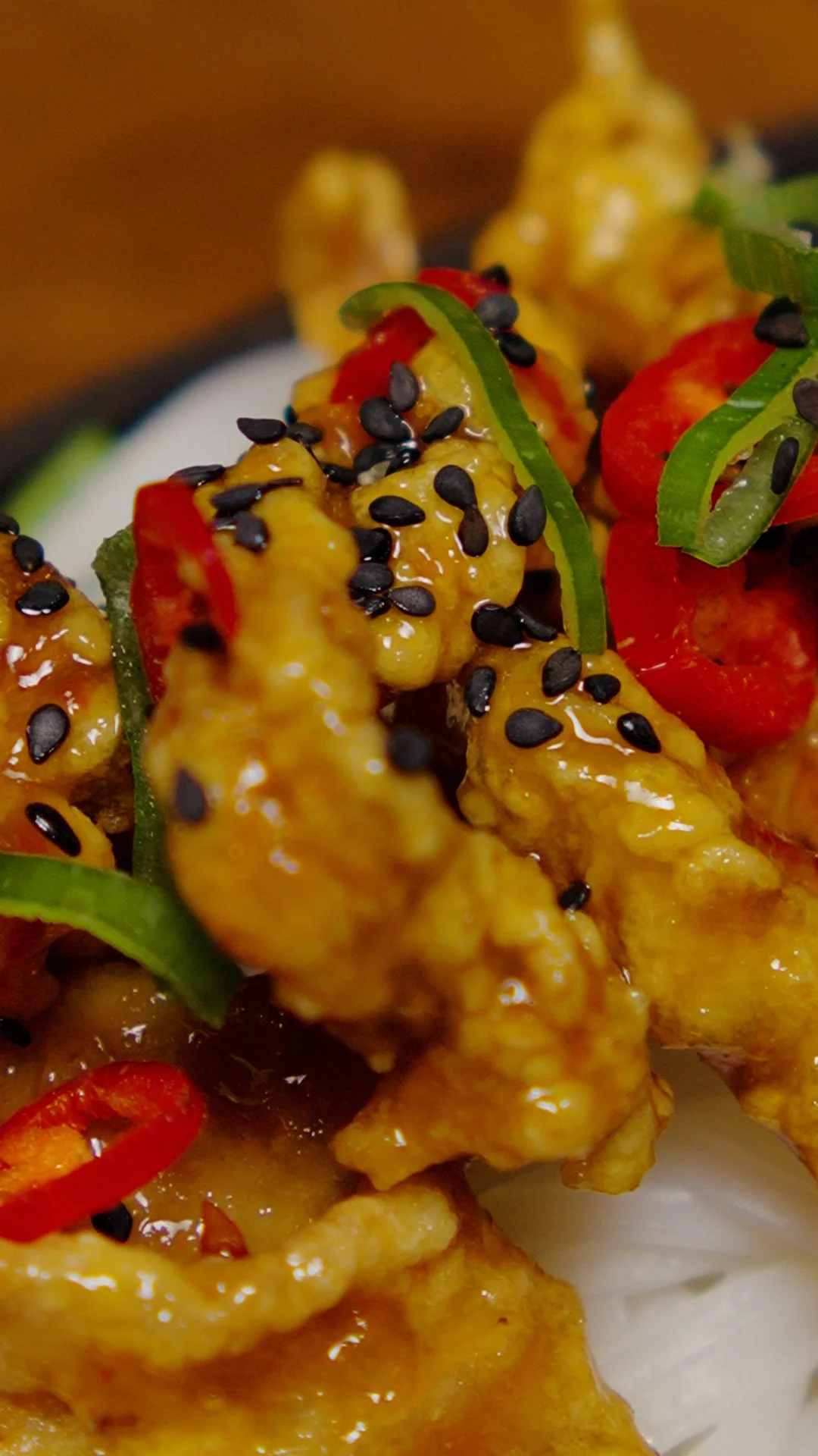Serve on a bed of noodles or rice, and garnish with spring onions, sesame seeds, and extra sliced chili.