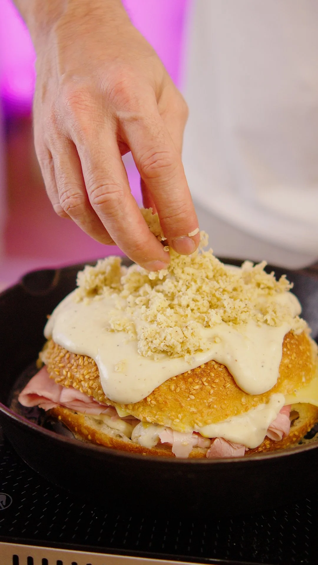 Fry the ftira gently in some butter in an ovenproof skillet (like cast iron) then add the remaining béchamel on top, and some more truffle cheddar.
